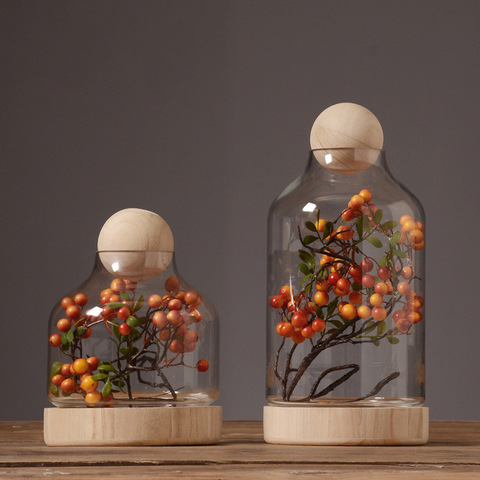 Moderno in vetro trasparente vaso di fiori con Base in legno casa giardino decorativo soffiato terrari per matrimonio rotondo aria porta piante